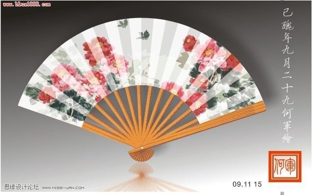 2.扇面上的画,折扇似呼是古代文人骚客的必备物件,自然上面都是书画佳作,所以我们最好准备一张国画,或者书法作品。置于扇面中,如图: