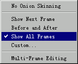 下面我们就来认识一下洋葱皮功能,开启“Frames”面板,单击“洋葱皮功能”按钮(如图9),弹出菜单中选项分别为:
